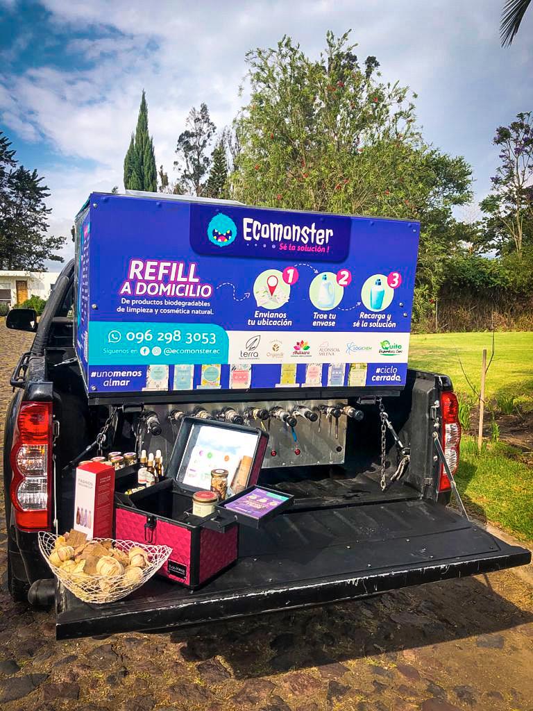 Este equipo distribuye y rellena cualquier envase con productos biodegradables de limpieza y cuidado personal, ofreciendo detergente, suavizante, lavavajillas, jabón, shampoo y acondicionador, entre otros productos orgánicos. @ecomonster.ec está constituido por Estefanía Rajoy, su esposo Edu y dos amigos de la pareja. Los jóvenes emprendedores trabajan con marcas ecuatorianas que utilizan materias primas de la mejor calidad y han desarrollado un sistema que les permite generar un ciclo cerrado de consumo responsable. “Cada envase que reutilizamos es #UnoMenosAlMar... Tomemos como ejemplo a nuestra familia, nuestros envases de shampoo y acondicionador tienen alrededor de 3 años. Eso significa al menos entre 120 a 140 envases que no compramos y botamos después de un solo uso”, ejemplifican.