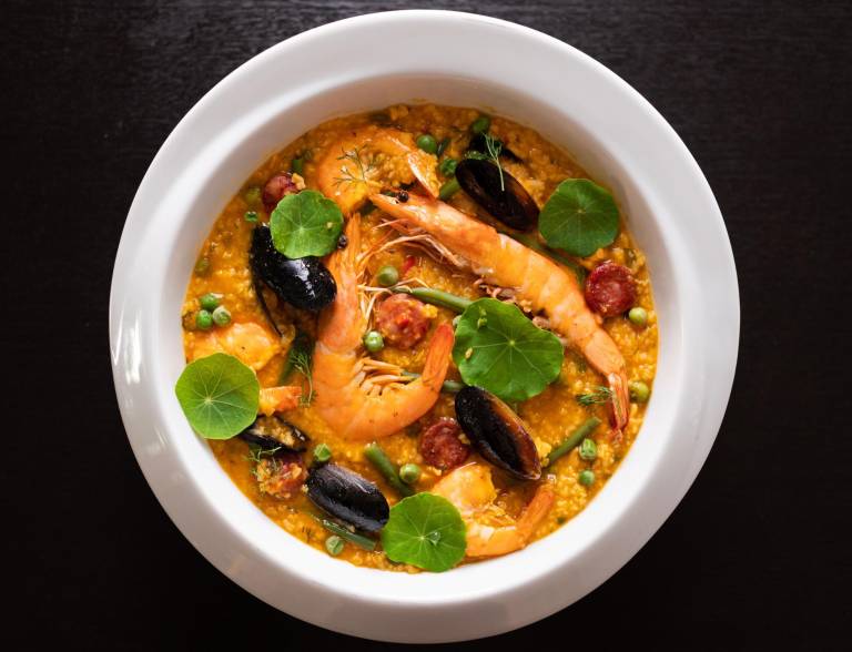 Ingredientes: 100 g de arroz envejecido, 6 unidades de camarones, 4 unidades de almejas, 4 unidades de mejillones, 30 g de chorizo de cerdo, 30 g de gallina, 1 o 2 unidades de langostinos, 30 g de vainita, 30 g de alverja, 50 g de cebolla perla y paiteña, 50 g de pimiento, 30 g de perejil, azafrán, aceite de oliva, pasta de ajo, y vino blanco.
