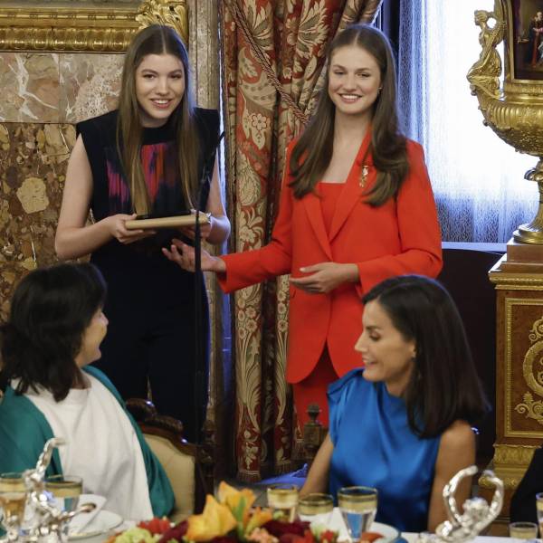 Tras el brindis que hizo Felipe VI en el Comedor de Gala como prólogo a un almuerzo con más de un centenar de invitados, sus hijas se levantaron desde los extremos de la mesa y se acercaron a un micrófono frente a sus padres para dedicarles unas palabras.