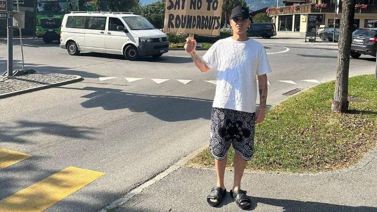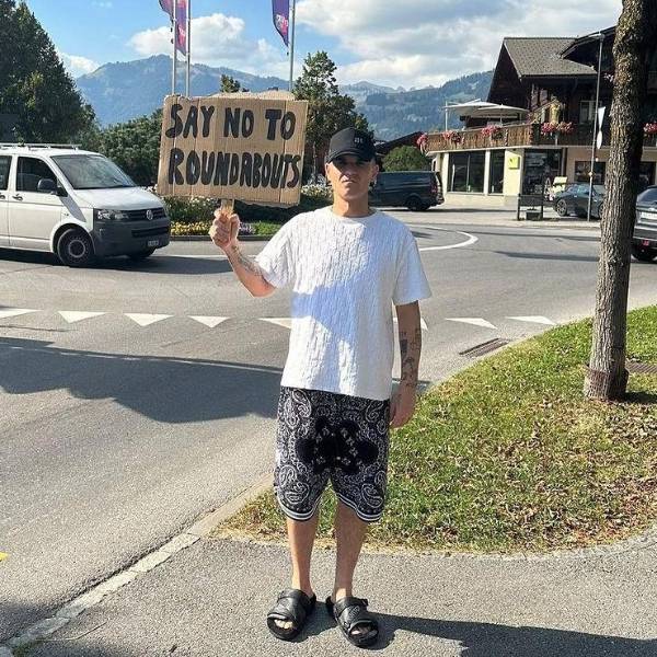 La estrella del pop publicó en Instagram una foto en la que posaba delante de una rotonda en pantalones cortos, chanclas y una gorra, sosteniendo un cartel que llevaba escrito "Di no a las rotondas".