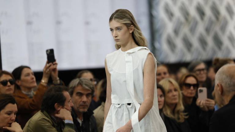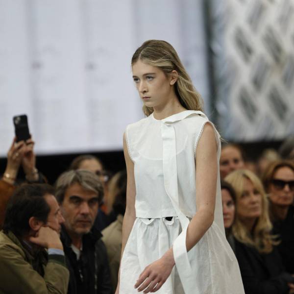 Fue la encargada de abrir el desfile de la colección Primavera-Verano 2025 de MiuMiu, y lució un atuendo sencillo pero muy vanguardista, conformado por un vestido blanco sin mangas y un lazo largo en el escote, unos zapatos de tacón negro de estilo 'peep toe' y unos medias largas grises que servían de protección para el clima parisino.
