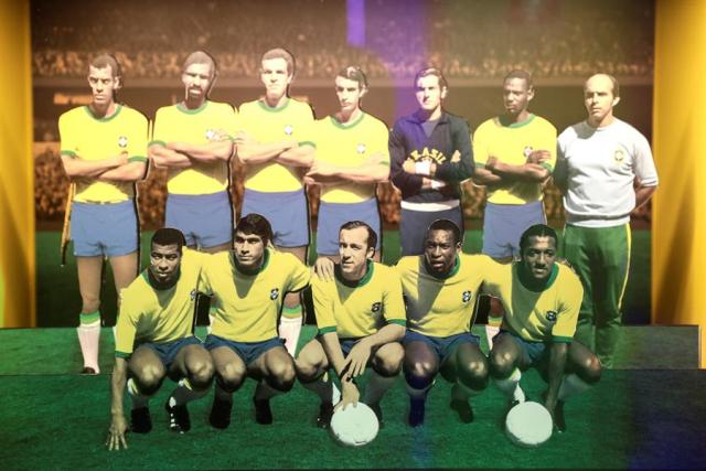Fotografía de una de las obras del Museo de Fútbol. En la imagen Pelé posando junto a su equipo.