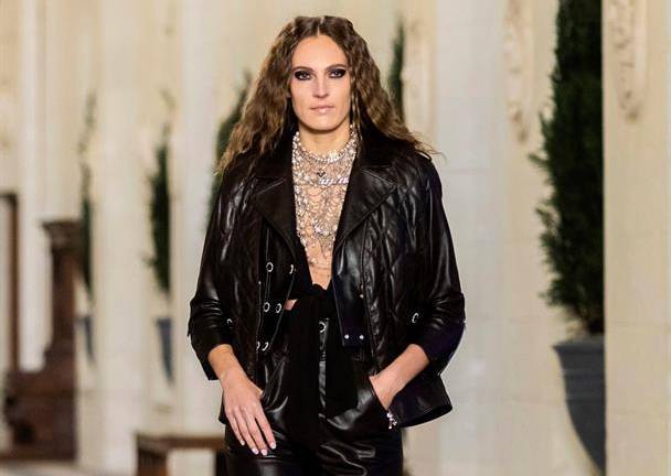 Sobre ella caminaron con paso firme medio centenar de modelos con chaquetas acolchadas en piel, minifaldas de estampado damero con aplicaciones brillantes, estructuradas chaquetas de hombreras militares y trajes de chaqueta en "tweed" con pantalones cortísimos.