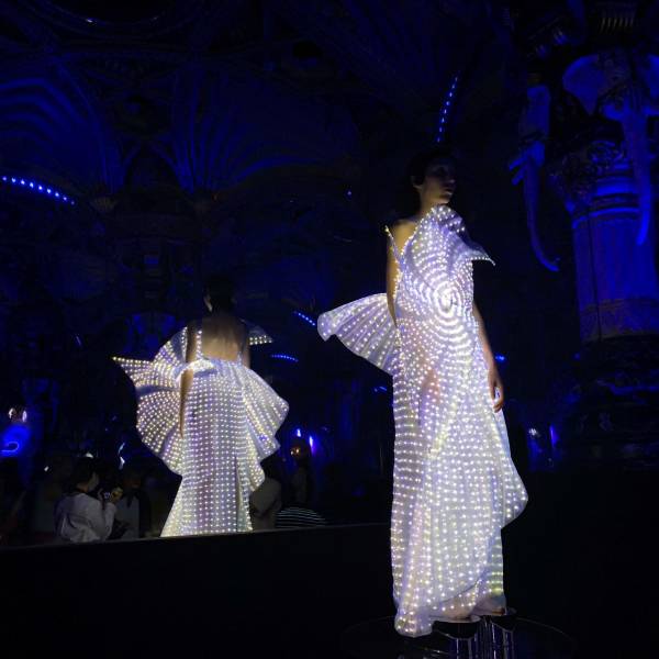 Presentada en el Museo Grévin de cera de París, los cinco vestidos han sido confeccionados en plisados de seda y organza que revisan una silueta clásica, de cortes rectos y minimalistas, engrandecidos con unos llamativos volantes circulares en los que se enrosca el cableado luminoso.