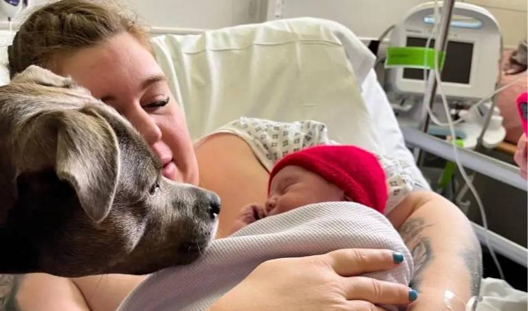 Mientras Amee se encontraba de parto, la pequeña Belle detectó que su humana se encontraba estresada, así que se acostó a su lado para tranquilizarla. "Ella me dio algo más en lo que concentrarme cuando todo lo demás sucedía a mi alrededor", mencionó la mujer.