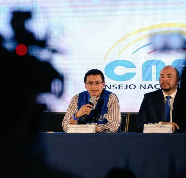 Justo en el mismo instante en que Participación Ciudadana brindaba una rueda de prensa en Quito, delegados del CNE hablaron a los medios en otro punto de la capital. Diego Tello, coordinador de Procesos Electorales, y Fausto Holguín, secretario general, fueron los encargados de aclarar varios de los resultados parciales sobre la segunda vuelta presidencial.