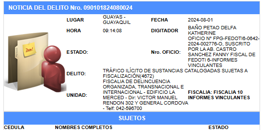 Moreno efectivamente es la presidenta de Acción Democrática Nacional (ADN), el movimiento que inscribió el presidente Noboa el año anterior ante el Consejo Nacional Electoral. Contra ella y otras cinco personas, hace siete meses la Fiscalía General del Estado abrió una investigación por el supuesto delito de “tráfico ilícito de sustancias catalogadas sujetas a fiscalización”.