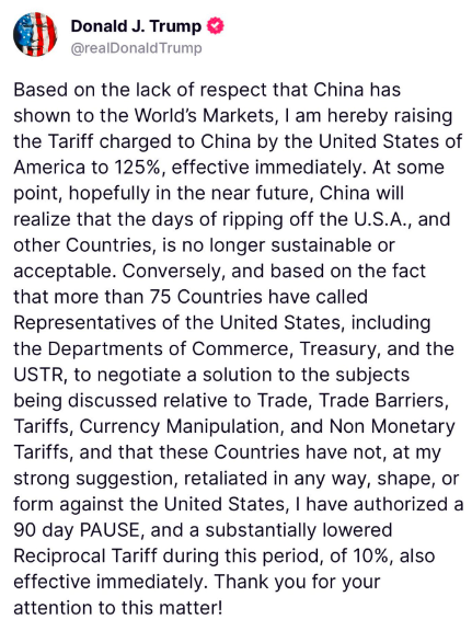 En cambio, subió la presión sobre China y elevó "con efecto inmediato" sus aranceles hasta el 125 % porque considera que Pekín cometió una "falta de respeto" al imponer gravámenes en represalia contra Estados Unidos.