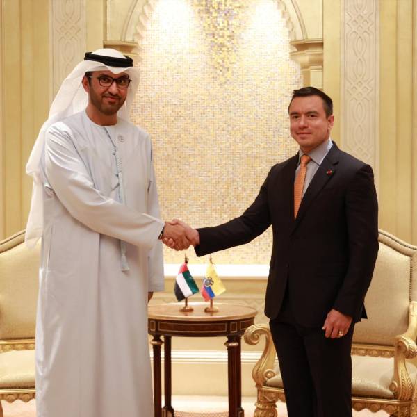 El presidente de Ecuador, Daniel Noboa, se reunió este sábado con el director general del grupo Abu Dhabi National Oil Company (ADNOC, por sus siglas en inglés), la empresa nacional de petróleo de Emiratos Árabes Unidos (EAU), el sultán H. E. Ahmed Al Jaber, con el objetivo de cooperar de manera integrada en este sector, aseguró la Presidencia.