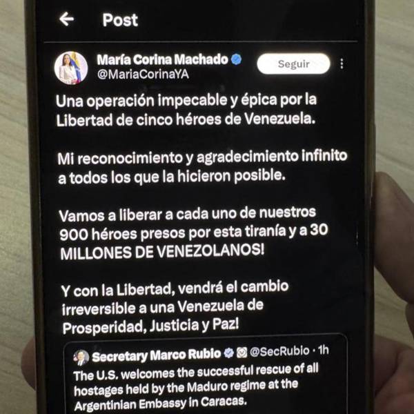 "Estados Unidos recibe con agrado el exitoso rescate de todos los rehenes retenidos por el régimen de Maduro en la Embajada de Argentina en Caracas", escribió Rubio en un mensaje en la red social X.