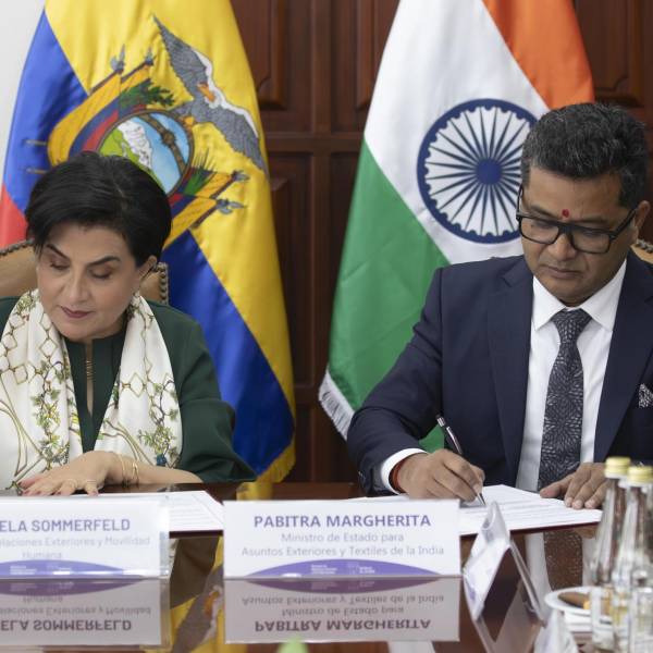 La ministra ecuatoriana de Relaciones Exteriores, Gabriela Sommerfeld, se reunió este miércoles con el ministro de Estado para Asuntos Exteriores y Textiles de la India, Shri Pabitra Margherita, en la sede de la Cancillería, en Quito, para fortalecer la relación bilateral y avanzar en nuevos ámbitos de cooperación.