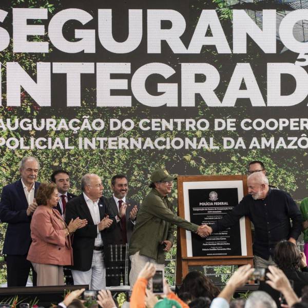 Los dos mandatarios y la vicepresidenta ecuatoriana develaron la placa de inauguración del centro, que fue creado con base a los acuerdos de la Carta de Belém, firmada en 2023 durante la Cumbre de la Organización del Tratado de Cooperación Amazónica (OTCA).