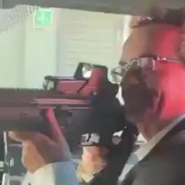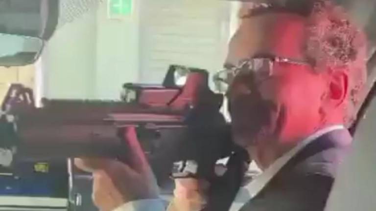 Un video difundido de manera anónima en la red social X esta semana muestra el momento en que Benjamin, aparentemente bromeando, apunta con el arma larga hacia la parte trasera del vehículo.