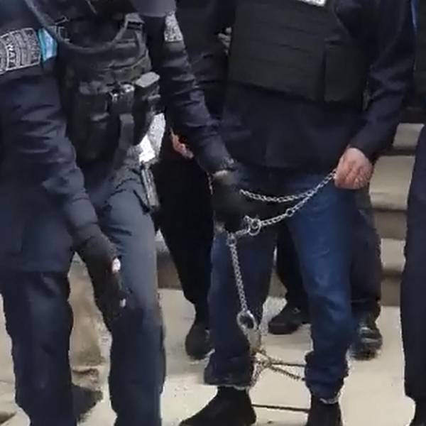 Vestido de azul, Hernández salió de su vivienda e inmediatamente policías le colocaron un chaleco antibalas y lo esposaron de pies y manos para trasladarlo a una unidad policial para ser presentado posteriormente ante un juez.