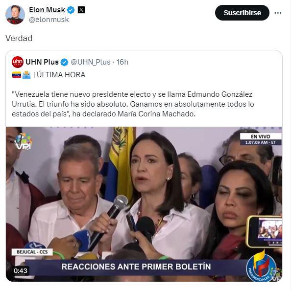 Más temprano, Musk catalogó -a través de X- de "gran fraude electoral" el triunfo de Maduro en las elecciones presidenciales que se celebraron este domingo, en las que el mayor bloque opositor, Plataforma Unitaria Democrática (PUD), cuestionó la validez de los resultados emitidos por el CNE, a la vez que la líder antichavista María Corina Machado dijo que el "nuevo presidente electo" es Edmundo González Urrutia, el abanderado de la PUD.