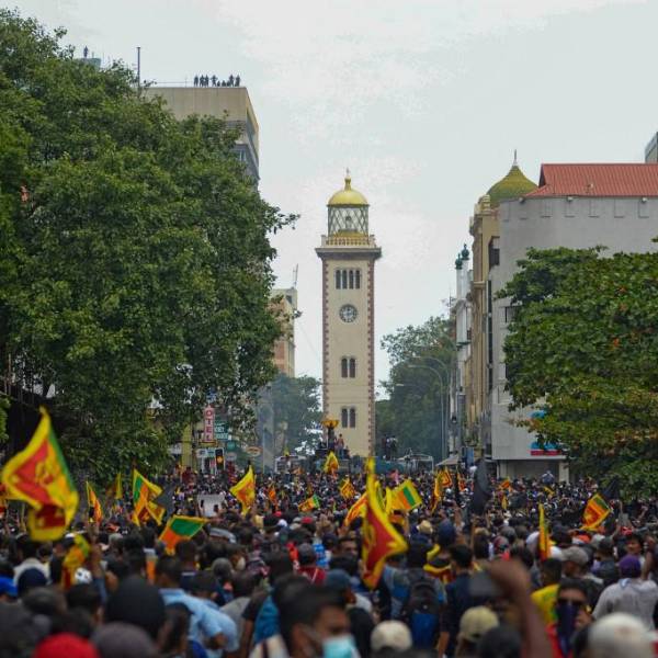 Decenas de miles de personas participaron previamente en una manifestación para pedir la dimisión de Rajapaksa, considerado responsable de la crisis que asola al país. La cadena privada Sirasa TV mostró imágenes de la muchedumbre irrumpiendo en el palacio presidencial, hasta ahora celosamente vigilado.