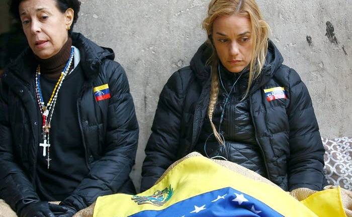 Las tres, sentadas en el suelo y rodeadas de los carteles con las fotos de los presos políticos y de Leopoldo López y Ledesma, pasan las horas atendiendo a los medios y rezando.