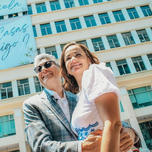 La propuesta tuvo lugar frente a la oficina de Aguiñaga, donde el empresario esperaba para sorprenderla con un gran banner de tela colgado en la fachada de un edificio en el que se leía la pregunta: “¿Marcela, te casas conmigo?”.