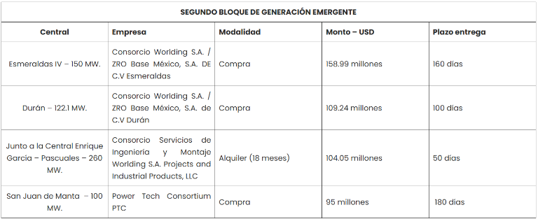 A través del Ministerio de Energía y Minas y la Corporación Eléctrica del Ecuador – CELEC EP se suscribió la compra y alquiler de 632.1 megavatios (MW) de generación térmica, por un monto de USD 467.28 millones, como se detalla a continuación: