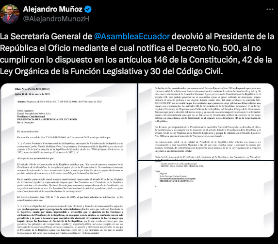 La Secretaría General de Asamblea Nacional devolvió al presidente Daniel Noboa el oficio mediante el cual notificó el Decreto No. 500, en el que encargaba su puesto a Cynthia Gellibert, a quien hace apenas unos días nombró vicepresidenta en reemplazo de Verónica Abad.