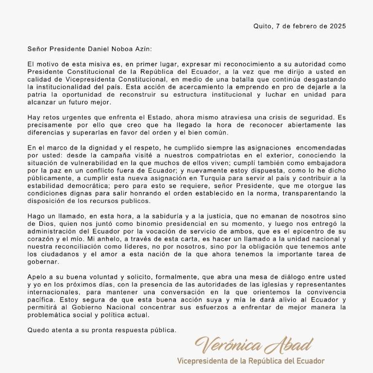 Abad publicó una carta este viernes 7 de febrero del 2025 tras la audiencia de seguimiento de la sentencia de la jueza Nubia Vera, quien ordenó a Noboa que la deje entrar a la Vicepresidencia para que cumpla sus funciones.