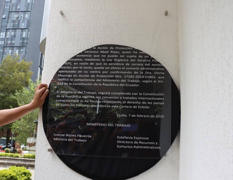 El Ministerio del Trabajo colocó una placa con un texto ilegible para cumplir con las disculpas hacia la vicepresidenta Verónica Abad tras el dictamen de la jueza Nubia Vera, quien concedió una acción de protección a favor de la funcionaria.
