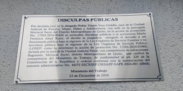 Tras la polémica placa ilegible, el Ministerio del Trabajo finalmente colocó una nueva y esta vez sí se puede leer el texto estipulado por la jueza Nubia Vera para que esa cartera de Estado se disculpe con la vicepresidenta Verónica Abad.