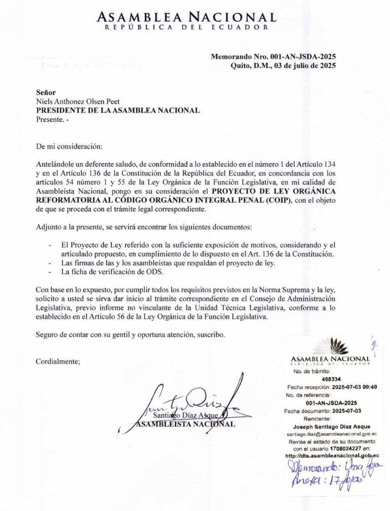 Antes de ser denunciado por el presunto delito de violación, el legislador Santiago Díaz Asque, quien fue expulsado de la Revolución Ciudadana, presentó un proyecto de ley para reformar el Código Orgánico Integral Penal (COIP), con el que planteaba que el consentimiento de las relaciones sexuales sea desde los 14 años.