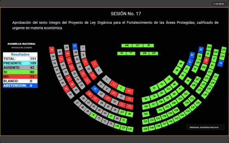 Con 80 votos a favor, el Pleno de la Asamblea Nacional aprobó este jueves el proyecto de Ley Orgánica para el Fortalecimiento de las Áreas Protegidas, iniciativa calificada como urgente en materia económica e impulsada por el presidente Daniel Noboa.