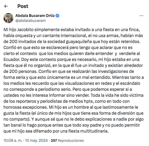 “Mi hijo Jacobito simplemente estaba invitado a una fiesta en una finca, había orquesta y un cantante internacional, el no usa arma, habían más de 200 invitados de la sociedad guayaquileña que hoy están retenidos. Simplemente es Bucaram y comenzará otra vez la persecución política”, escribió Bucaram padre en su cuenta de X.