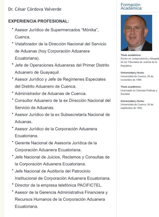 Sobre Córdova Valverde, el CPCCS informó que él es doctor en Jurisprudencia y abogado de los Tribunales de la República, cuenta con estudios de cuarto nivel en Criminalística, Ciencias Políticas y Sociales, Reforma Procesal Penal, Derecho Constitucional y Derechos Humanos, cursante de doctorado en Derecho Constitucional y de Maestría en Derecho y Estudios Jurídicos Avanzados. Además, trabajó como secretario del CPCCS durante 8 meses.
