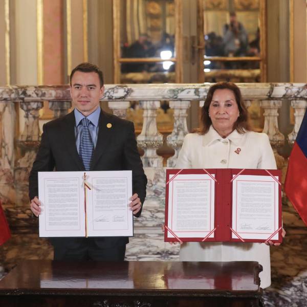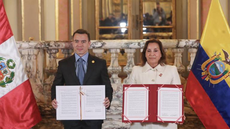 El presidente de Ecuador, Daniel Noboa, y su homóloga peruana, Dina Boluarte, firmaron este jueves en Lima un acuerdo conjunto para fortalecer la relación bilateral en materia de seguridad, migración, e impulso del empleo inclusivo, entre otros temas.
