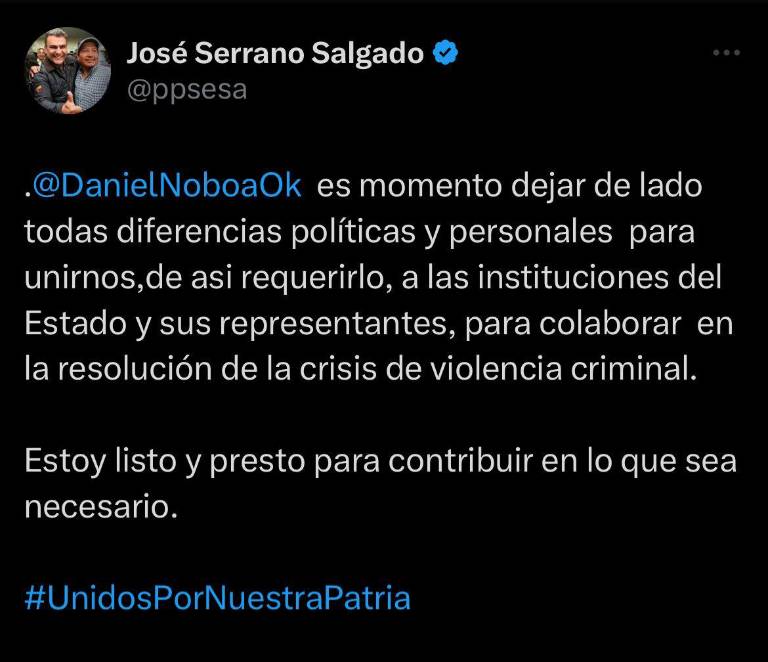 Por su parte, el exministro del Interior del Gobierno de Rafael Correa, José Serrano, escribió en redes sociales que era "momento de dejar de lado todas las diferencias políticas y personales para unirnos, de así requerirlo, a las instituciones del Estado y sus representantes, para colaborar en la resolución de la crisis de violencia criminal".