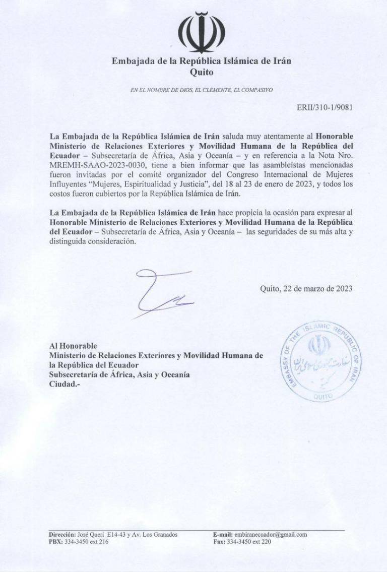 "Las asambleístas mencionadas fueron invitadas por el comité organizador del Congreso Internacional de Mujeres Influyentes ‘Mujeres, Espiritualidad y Justicia’ del 18 al 23 de enero del 2023, y todos los costos fueron cubiertos por la República Islámica de Irán", detalló la Embajada.