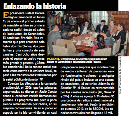Este párrafo corresponde a un artículo de Vistazo, en su edición del 20 de noviembre de 2014. En aquel entonces se mencionaba que el presidente Rafael Correa estaba a próximo a "celebrar" su enlace número 400. Hoy el contexto es otro. Correa está a días de dejar el sillón de Carondelet y realizará su último enlace o informe de labores a sus mandantes, como él repitió durante 10 años.