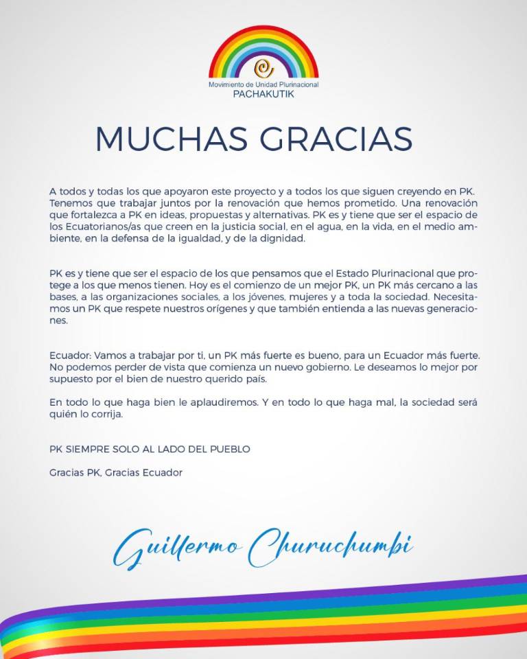 En un comunicado publicado este jueves en redes sociales, el nuevo coordinador nacional de Pachakutik indicó que tienen que trabajar juntos por la renovación que su candidatura prometió.