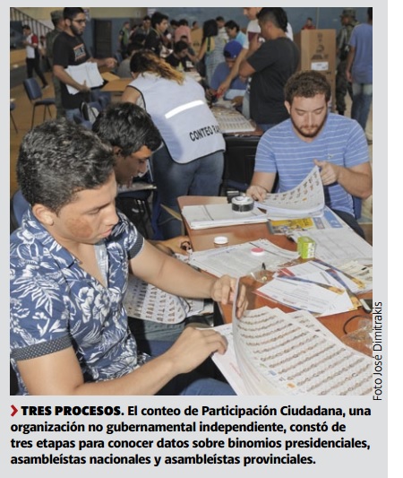 Ambos conteos rápidos, el de PC con sello independiente; y el del CNE, que era el oficial, estaban observando lo mismo. En determinado momento vimos que el binomio de Lenín Moreno se ubicaba entre 37,8 y 39,8, pero no llegaba al 40 por ciento requerido para ganar en primera vuelta. Era recomendable difundirlo para aclarar el panorama. El conteo de PC se hizo con apoyo de 10.500 voluntarios; y el del CNE que estimo pudo haber costado un millón de dólares, incluyendo el call center y un pago a los observadores.