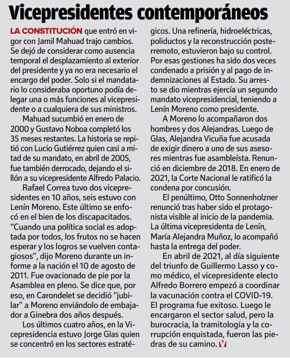 “En cualquier gobierno presidencial, la Vicepresidencia es esencial. ¿Y por qué lo digo? Porque el principal rol del vicepresidente es reemplazar al presidente. Por supuesto que a veces la Constitución ha sido esquivada, como fue mi caso, pero indudablemente esa es la función fundamental de un vicepresidente de la República”, dijo Rosalía Arteaga quien fue segunda a bordo en los gobiernos de Abdalá Bucaram y Fabián Alarcón.