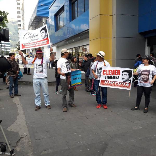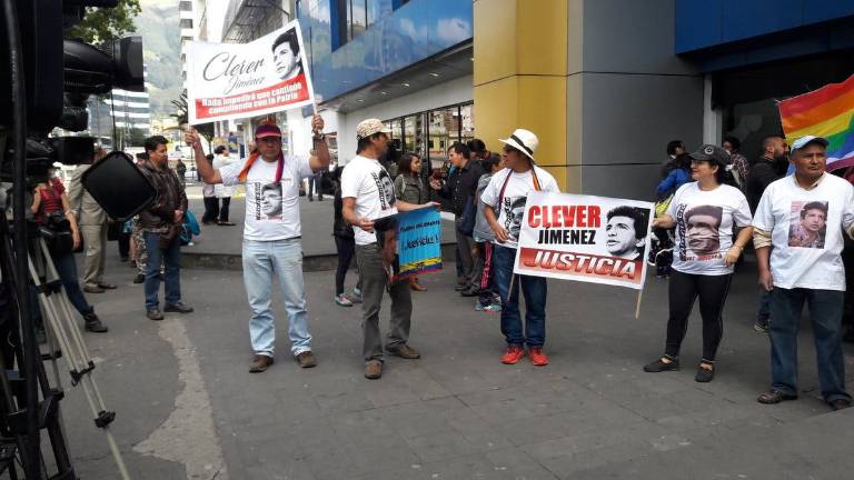 Desde temprano seguidores, amigos y familiares del Cléver Jiménez llegaron a las afueras de la Unidad de Flagrancia en Quito, hasta donde llegaría el exasambleísta para recibir su brazalete electrónico. Ellos rechazan la disposición judicial y gritan desde la calle "No a la prisión electrónica".