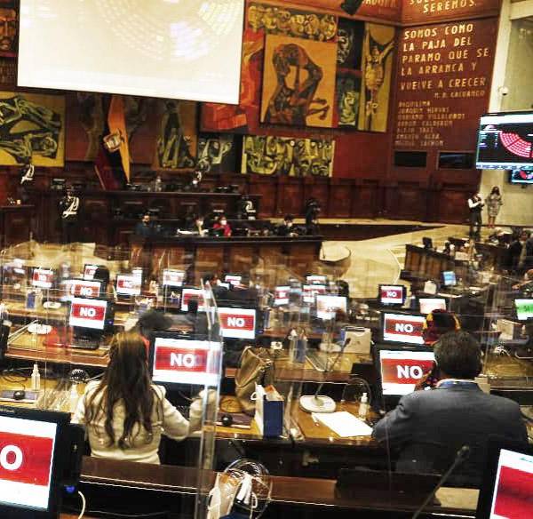 En las varias votaciones realizadas, el Pleno se ha dividido en torno a dos ejes, el uno formado por UNES y PSC, al que debía haberse adherido también CREO para alcanzar la mayoría, y el otro por Izquierda Democrática y Pachakutik.