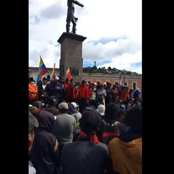 En el clip, grabado en la Plaza de Santo Domingo, centro histórico de Quito, aparece un grupo de dirigentes rodeados de cientos de manifestantes, una de las personas al mando explica que han podido pasar "dos filtros" sin dificultad y que avanzan hacia en Palacio de Gobierno.