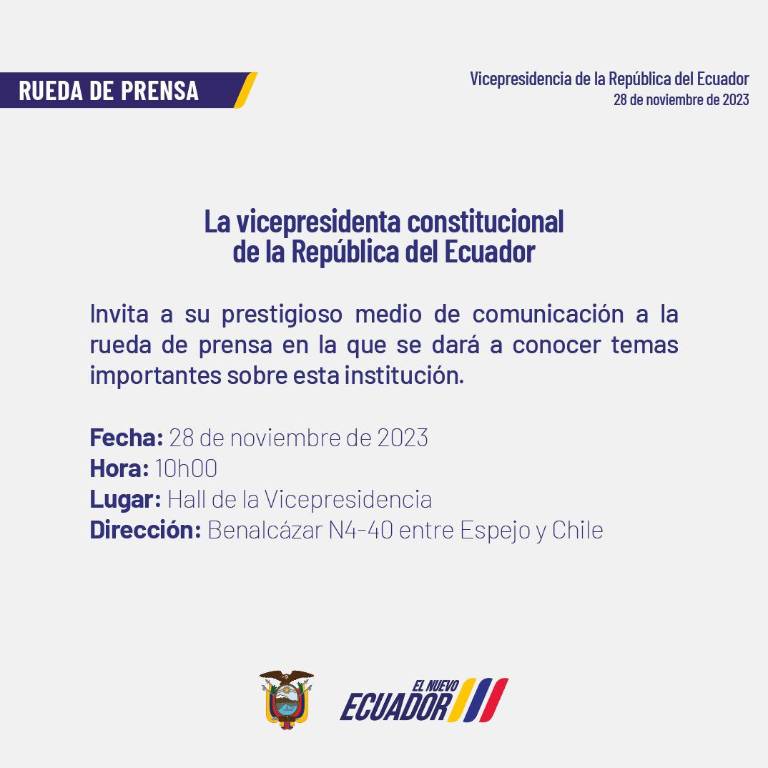 En el comunicado, difundido este lunes a través de redes sociales, la segunda mandataria extendió una invitación a medios de comunicación para que asistan a la cita y precisó que esta se realizaría a las 10h00 del martes 28 de noviembre, en el edificio de la Vicepresidencia, ubicado en el centro de Quito.