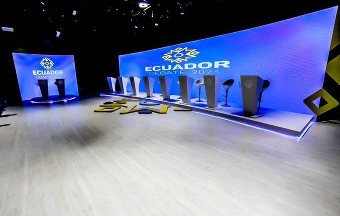La ubicación de los candidatos en el set de televisión es, de izquierda a derecha: Yaku Pérez, Bolívar Armijos, (Fernando Villavicencio, quien fue asesinado el 9 de agosto), Luisa González, Xavier Hervas, Daniel Noboa, Otto Sonnenholzner y Jan Topic. Ellos hablan sobre cinco ejes temáticos: seguridad, régimen económico, política social, democracia e institucionalidad, y sostenibilidad.