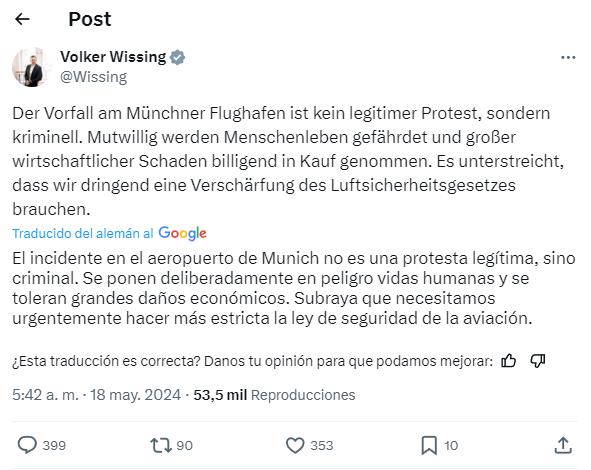 El ministro de Transportes alemán, Volker Wissing, subrayó que no se trata de una "manifestación legítima, sino de una intervención contra el tráfico aéreo".
