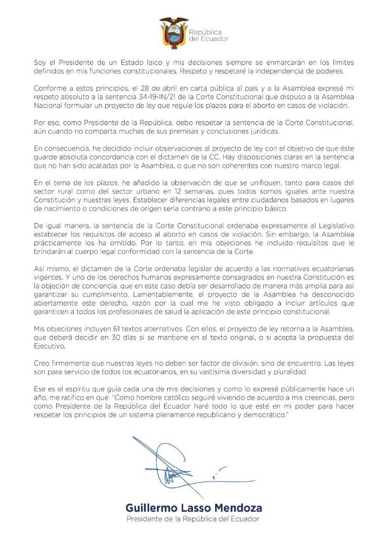 "Mis objeciones incluyen 61 textos alternativos. Con ellos, el proyecto de ley retorna a la Asamblea que deberá decidir en 30 días si se mantiene en el texto original, o si s acepta la propuesta del Ejecutivo", insistió Lasso en su misiva.