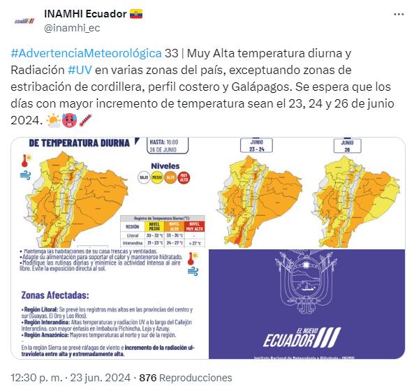 Diversas partes de Ecuador experimentarán altas temperaturas el 23, 24 y 26 de junio de 2024. Así lo informó el Instituto Nacional de Metereología e Hidrología (Inamhi) a través de sus redes sociales.