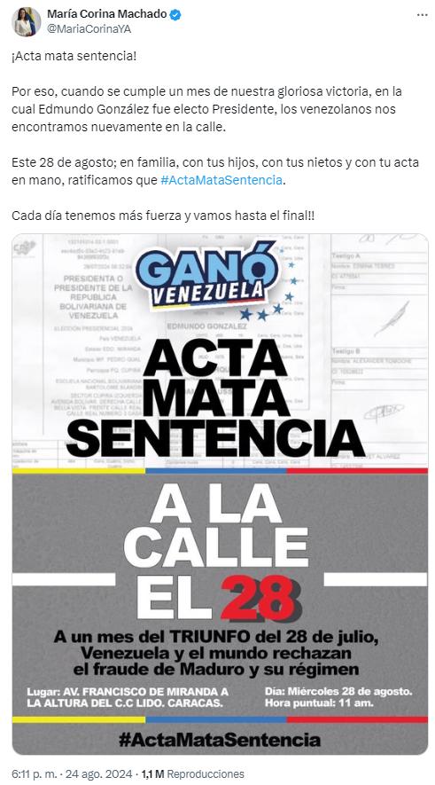 "Los venezolanos nos encontramos nuevamente en la calle. Este 28 de agosto; en familia, con tus hijos, con tus nietos y con tu acta en mano, ratificamos que #ActaMataSentencia", publicó Machado en X, junto a una imagen que reza "a la calle el 28".