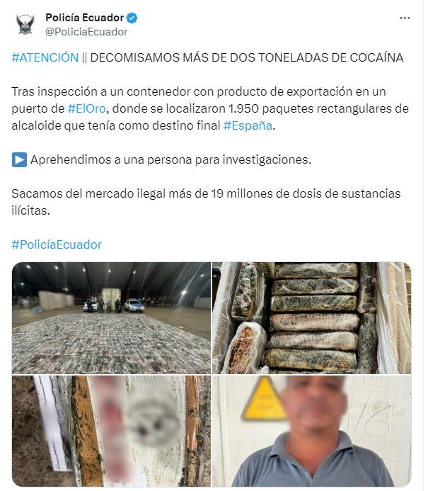 La incautación se realizó después de una inspección a un contenedor con mercancía de exportación en un puerto de la provincia de El Oro, aunque no se dio detalles de la compañía responsable del envío.