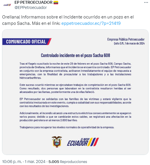 El hecho ocurrió en la noche del jueves 29 de febrero en el campo Sacha, el de mayor producción del país, durante los trabajos de completación del pozo Sacha 608.
