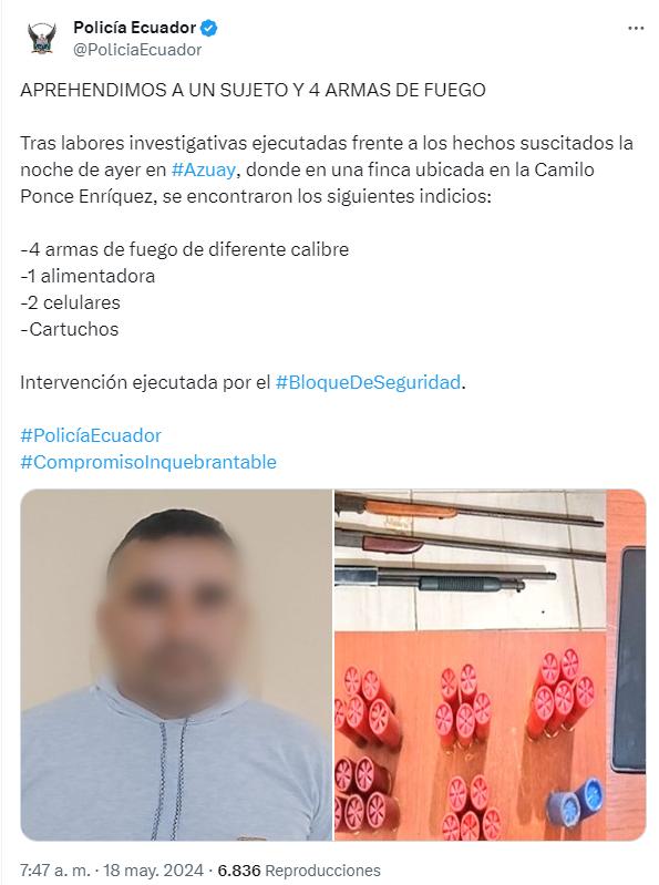 Este sábado, la Policía informó de la detención de un sospechoso del violento ataque en Azuay y precisó que en una finca ubicada en el mismo cantón del suceso encontraron cuatro armas de fuego de diferente calibre, una alimentadora, dos celulares y cartuchos.